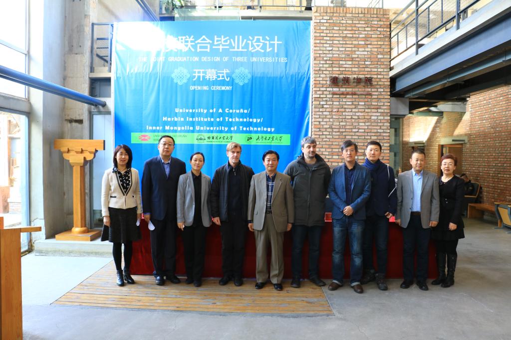 此次联合设计在我校的教学交流活动将一直持续到3月11日,联合设计的开题环节由我校组织,之后的中期讨论、汇报在哈尔滨工业大学进行,毕业答辩环节在西班牙拉科鲁尼亚大学完成。本次活动共有15位西班牙学生、16位哈工大学生、11位我校学生参加联合毕业设计。在我校期间,将组织4场学术报告,分别由我校外聘硕士生导师温捷强(教授级高级工程师,内蒙古新雅建筑设计有限责任公司董事长)做“场域------地域建筑的探索与研究”,外聘硕士生导师富志强(教授级高级工程师,呼和浩特市规划局副局长)做“呼和浩特城市发展与未来建设”,张鹏举教授做“自然建造”,拉科鲁尼亚大学Jesús Irisarri教授做“Beyond appearance”的学术报告;组织毕业设计题目“呼和浩特昭君墓园及周边区域城市设计与建筑设计”的基地调研;组织三校师生对毕业设计进行深入的构思、图纸绘制、模型制作和汇报文件制作。