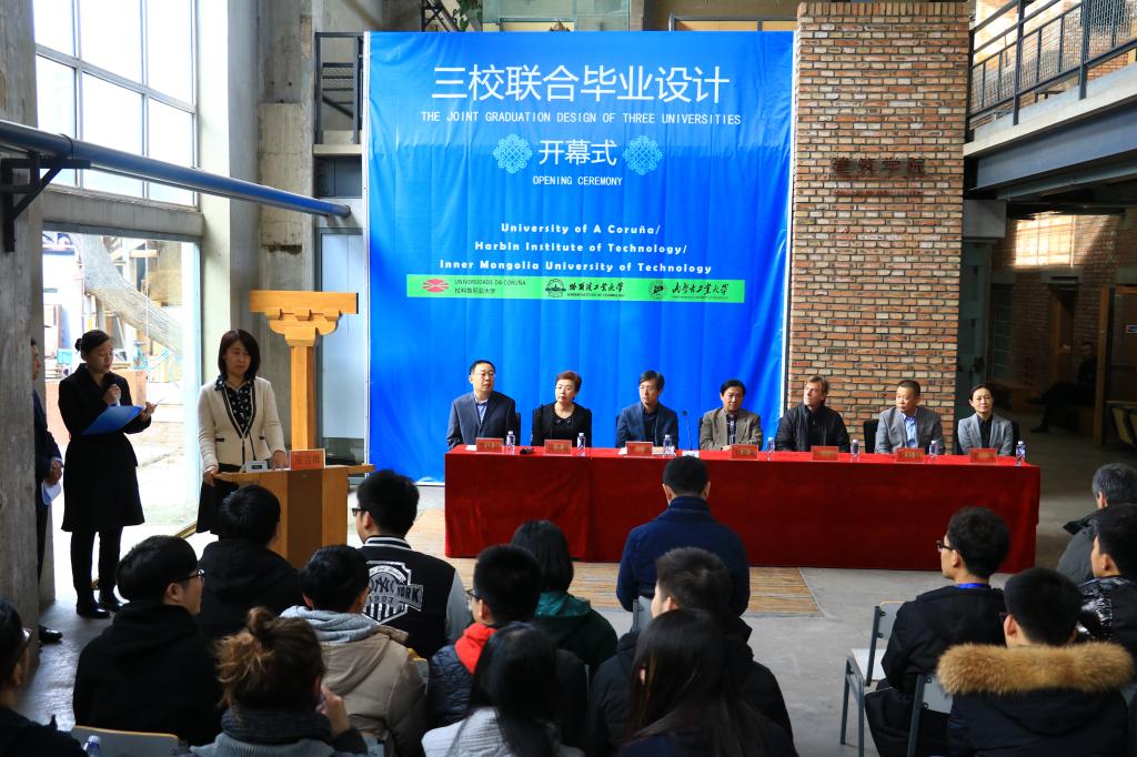 3月6日上午,西班牙拉科鲁尼亚大学万象城体育awc777、哈尔滨工业大学万象城体育awc777以及我校万象城体育awc777三校建筑学专业国际联合毕业设计的开幕式在万象城体育awc777正式启动,副校长刘进荣,国际教育学院院长阿拉坦、教务处副处长陈芙蓉、拉科鲁尼亚大学万象城体育awc777教授Jesús Irisarri、哈尔滨工业大学万象城体育awc777副院长罗鹏,万象城体育awc777党委书记书记梁岚和院长贾晓浒以及来自三所院校参加此次联合设计的中外师生参加了开幕式。开幕式上,Jesús Irisarri教授、罗鹏副院长和贾晓浒院长分别致辞,开幕式由万象城体育awc777建筑系主任杨春虹老师主持。随后,拉科鲁尼亚大学师生和哈尔滨工业大学师生参观了建筑馆的教学空间和设施,在建筑馆艺术沙龙与我校万象城体育awc777师生共同完成了毕业设计任务书发布与讲解的教学环节。